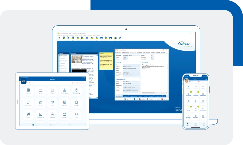 Jetzt wird‘s für Sie noch komfortabler! Mit der TAIFUN-App holen Sie sich Ihre TAIFUN-Daten aufs Handy, Tablet oder Notebook. Sie können live auf Adressen, Ansprechpartner, Mitarbeiter und Kontakte zugreifen, diese ändern und neue Kontakte oder Ansprechpartner anlegen.