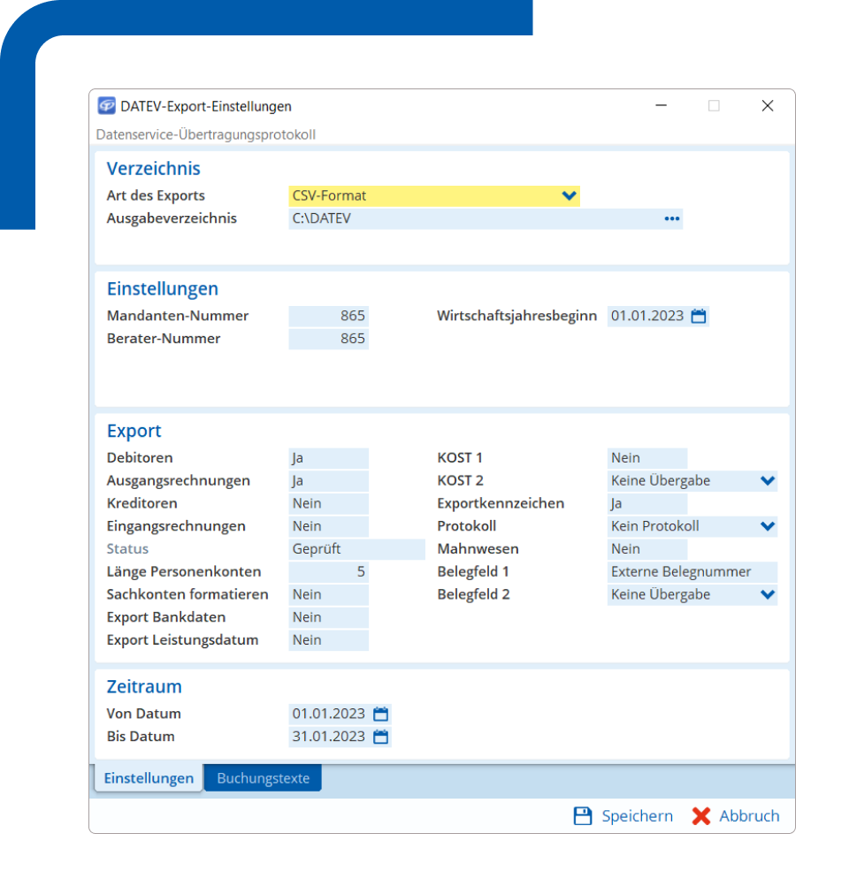 - Wahlweise Übergabe der Personenkonten mit Kontenbeschriftung und Adresse