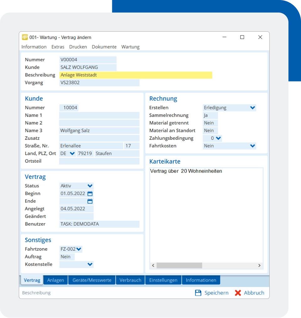 • verwalten Sie Termine, Verträge, Geräte & Messwerte.