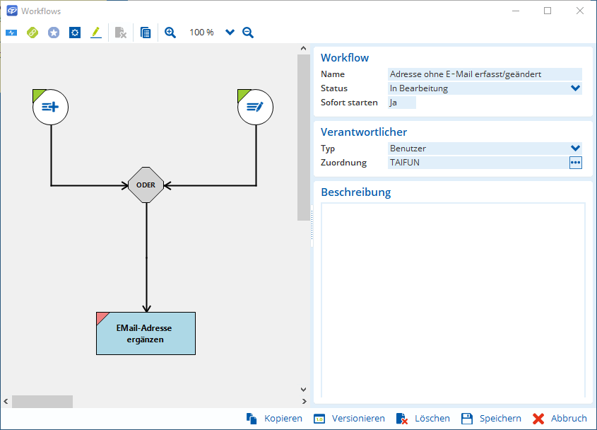 Die obige Ansicht visualisiert einen eingerichteten Workflow am Beispiel der Adressanlage.