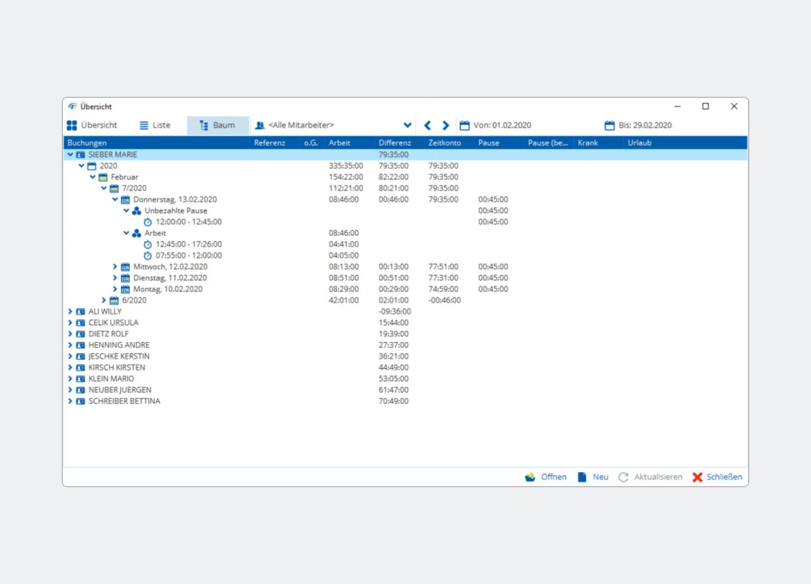 Hinterlegen Sie je Mitarbeiter entsprechende Personalnummern, die Abteilung und den Urlaubsanspruch sowie weitere wichtige Daten wie die Lohnart. Das und die Definition von frei konfigurierbaren Arbeitszeitmodellen stellen den Kern einer effizienten Zeiterfassung und Personalplanung dar.