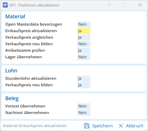 Das Fenster Positionen aktualisieren wird geöffnet.