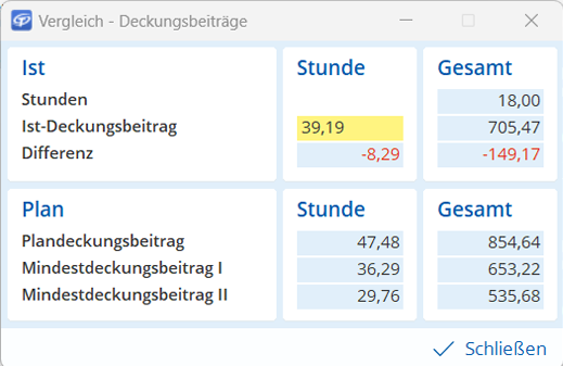 Im Bereich Plan und Stunde finden Sie die jeweiligen Deckungsbeiträge pro Stunde, im Bereich Gesamt die jeweiligen zu erreichenden Deckungsbeiträge bezogen auf den markierten Titel.