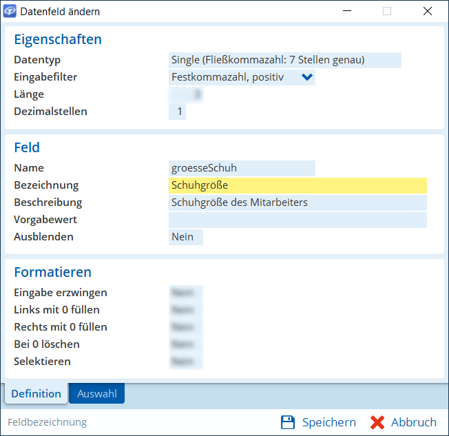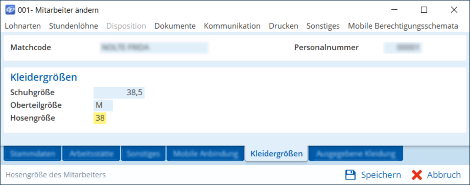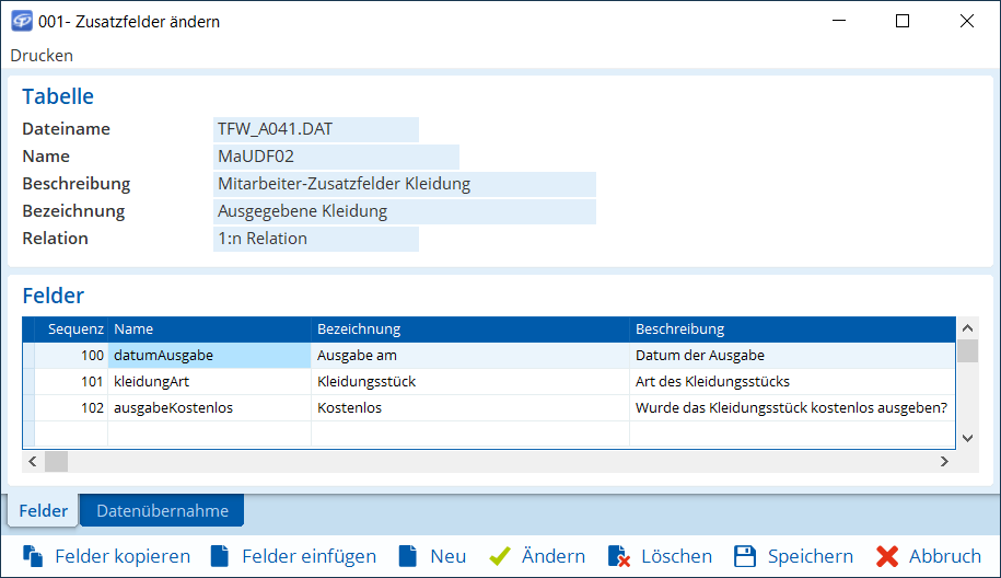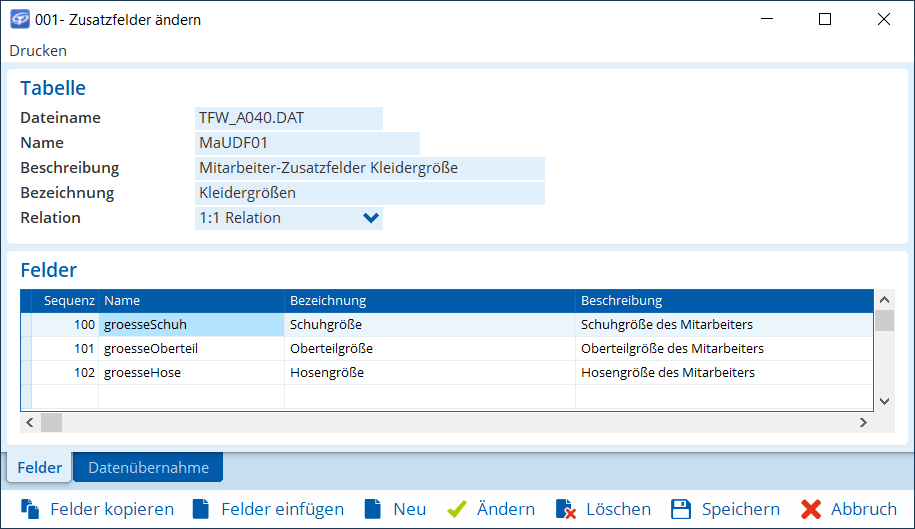 Definieren Sie nun die Zusatzfelder in der Datenbanktabelle, die im Dialog Mitarbeiter in der Registerkarte Kleidergrößen angezeigt werden sollen. Gehen Sie wie folgt vor: