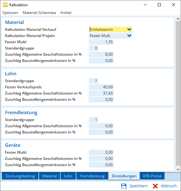 Vorkalkulation über Standardeinstellungen