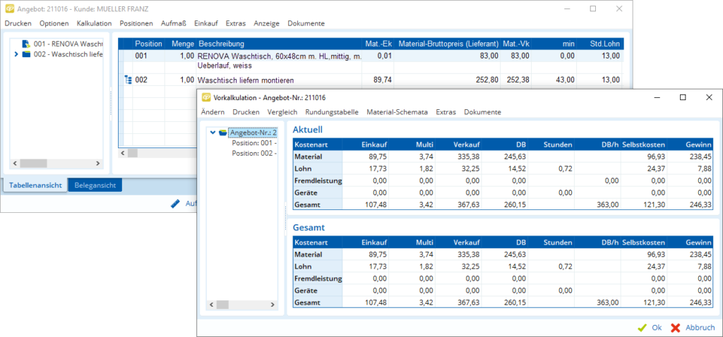 Und so sieht es dann bei der Angebotskalkulation aus: Sollten Sie in Ihren Angeboten von den Standardeinstellungen abweichen wollen, um beispielsweise einen Mitbewerber zu unterbieten, geht selbstverständlich auch das!