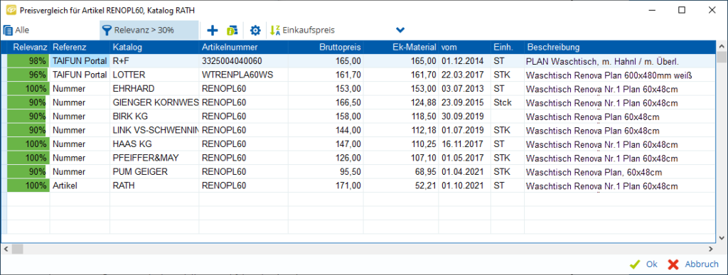 Sehen Sie, welche Lieferanten die gewünschten Artikel im Programm haben, wann es die letzte Preisänderung gegeben hat und welcher Lieferant der Günstigste ist.