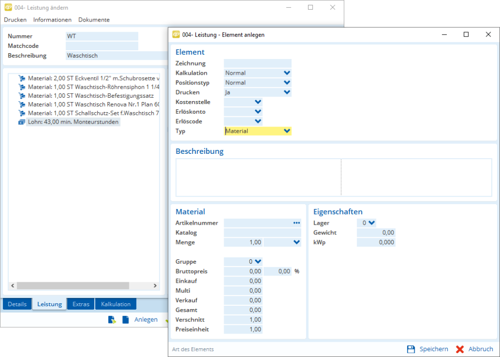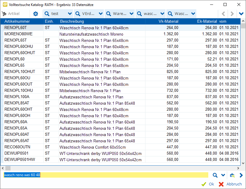 Auf der Suche nach dem richtigen Material für Ihre Angebote unterstützt Sie TAIFUN mit einer integrierten Volltextsuche.