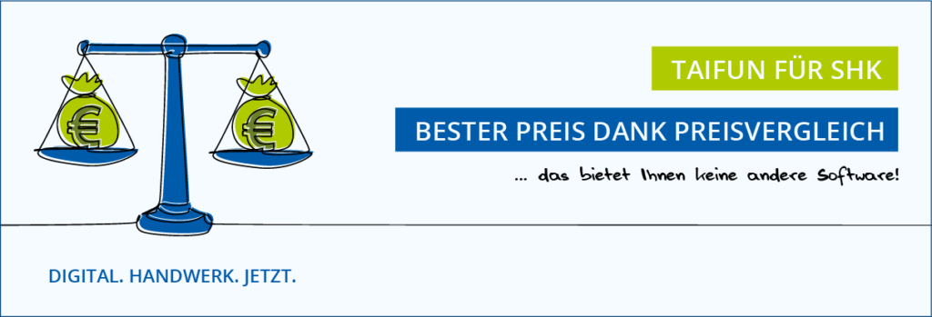 Wollen Sie wissen, ob es einen Artikel bei einem Ihrer Großhändler günstiger gibt und noch verfügbar ist? TAIFUNs Preisvergleich macht’s möglich! TAIFUN vergleicht Millionen Großhandelsartikel aus dem SHK-Bereich und ermittelt den günstigsten Preis – dank modernster Suchalgorithmen selbst ohne Artikelnummer, EAN oder Werksnummer.