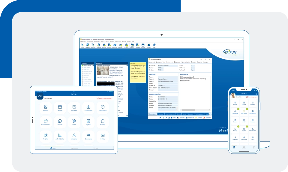 Alle Daten auf einen Klick, immer und überall: Mit TAIFUN verwalten Sie Ihre Kundenadressen, wie Lieferanten, Mieter/Wohnungsgesellschaften zentral und erstellen Angebote oder Aufträge einfach und direkt aus der Adresse heraus.