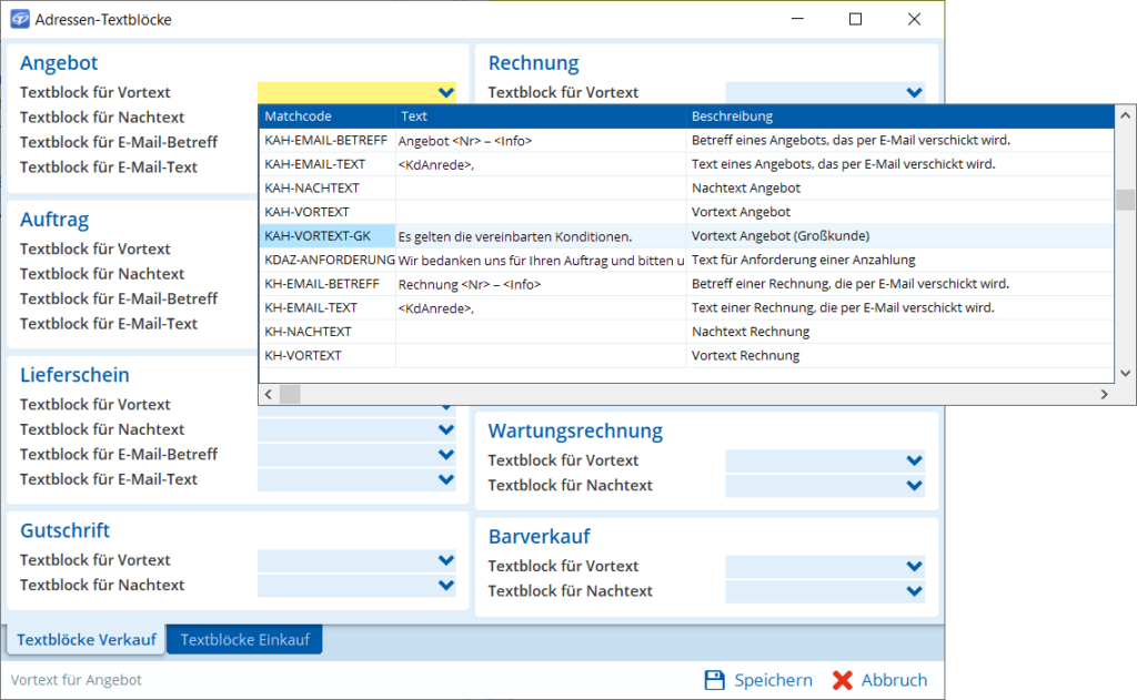 Ab sofort können Sie spezielle Textblöcke unter dem neuen Menüpunkt Sonstiges | Vor- und Nachtexte für einzelne Adressen hinterlegen. Diese Textblöcke überschreiben die Voreinstellungen in den Konstanten und werden bevorzugt verwendet, wenn automatisch Textblöcke für Vor- und Nachtext gezogen werden.
