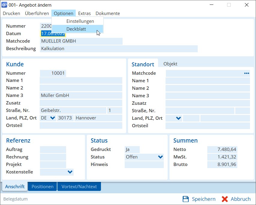 Ab sofort können Sie auch in einem Angebot ohne zugeordnetes Projekt ein Deckblatt anlegen. Beim Überführen eines Angebots in ein Projekt wird das Deckblatt übernommen.
