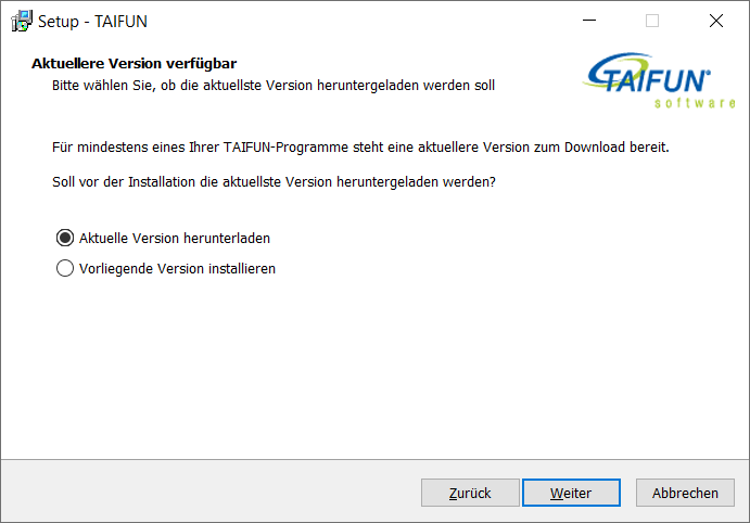 Bei der Installation von TAIFUN wird nun automatisch geprüft, ob online eine neuere Version der Installationsdatei zur Verfügung steht als lokal. Falls dies der Fall ist, so können diese automatisch heruntergeladen werden. Die Installationsdatei steht Ihnen unter folgender URL zum Download zur Verfügung: https://downloads.taifun-software.de/setup.exe