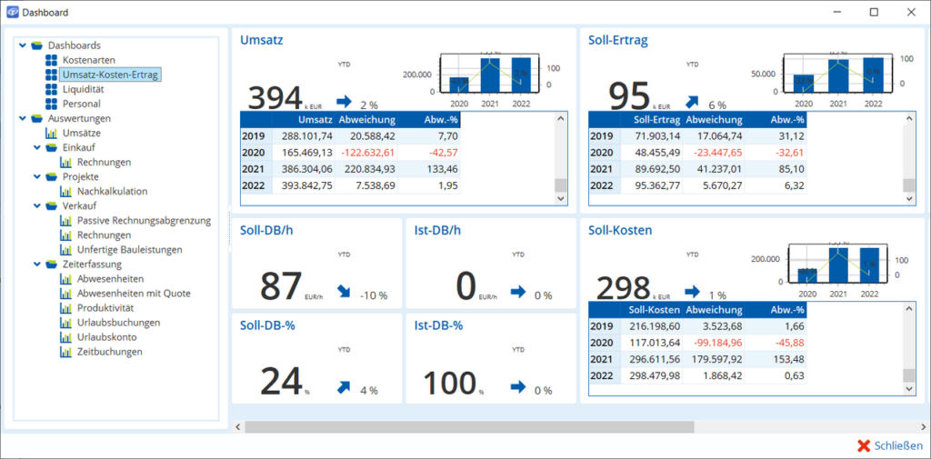 Das Dashboard wertet die in TAIFUN verfügbaren Informationen für verschiedene Bereiche aus, um Kennzahlen für betriebswirtschaftliche Auswertungen zu ermitteln und grafisch darzustellen. Lassen Sie sich Umsätze, Krankheitstage und vieles mehr mittels Diagrammen und Tabellen darstellen.
