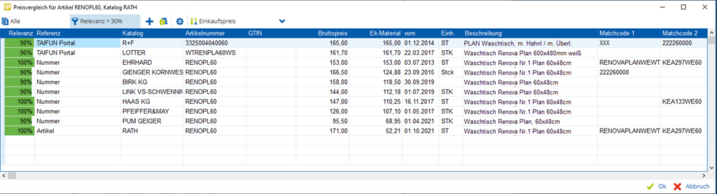Das bietet Ihnen keine andere Handwerkersoftware auf dem Markt: TAIFUN kann Millionen Großhandelsartikel aus dem Bereich Sanitär und Heizung miteinander vergleichen und ermittelt für Sie sekundenschnell den günstigsten Preis – dank modernster Suchalgorithmen selbst ohne Artikelnummer, EAN oder Werksnummer.