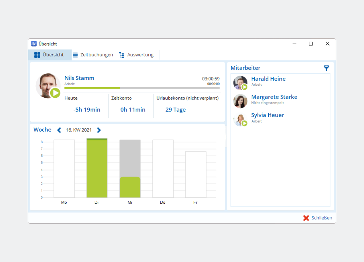 Hinterlegen Sie je Mitarbeiter entsprechende Personalnummern, die Abteilung und den Urlaubsanspruch sowie weitere wichtige Daten wie die Lohnart. Das und die Definition von frei konfigurierbaren Arbeitszeitmodellen stellen den Kern einer effizienten Zeiterfassung und Personalplanung dar.