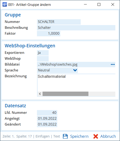 Die Artikelgruppe wird angelegt, z. B. ELEKTRO - Elektro.