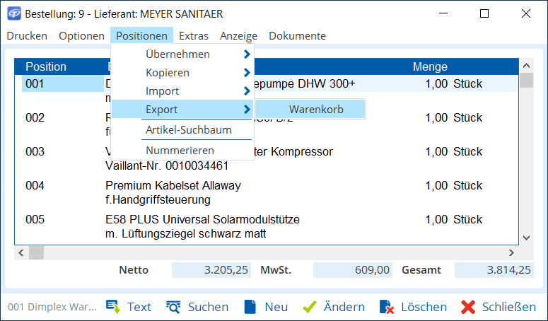 Die Artikel möchten wir nun direkt im Warenkorb des Großhändlers bestellen und nicht über den Umweg, eine Bestellung als PDF-Datei per E-Mail zu senden. Dazu wählen wir in der Bestellung Positionen > Export > Warenkorb.