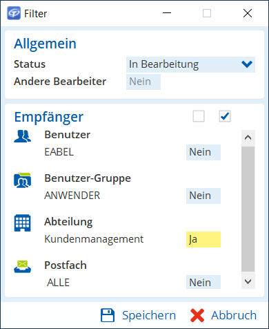 . Dadurch werden alle Empfänger auf den Wert Nein gesetzt. Anschließend setzen wir den Wert beim Feld Abteilung auf Ja.