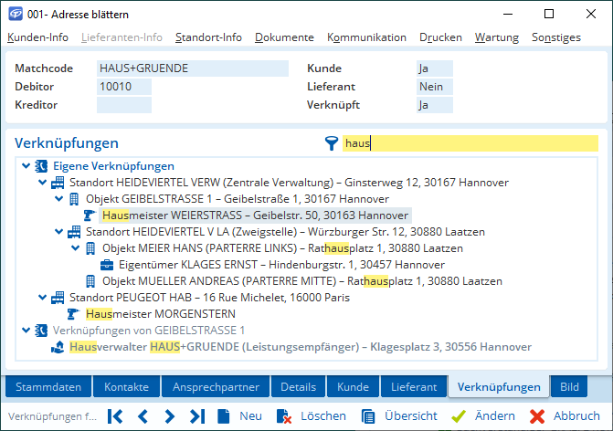 - Vordefinierte Verknüpfungstypen (Standort, Objekt, Eigentümer, Hausmeister etc.)